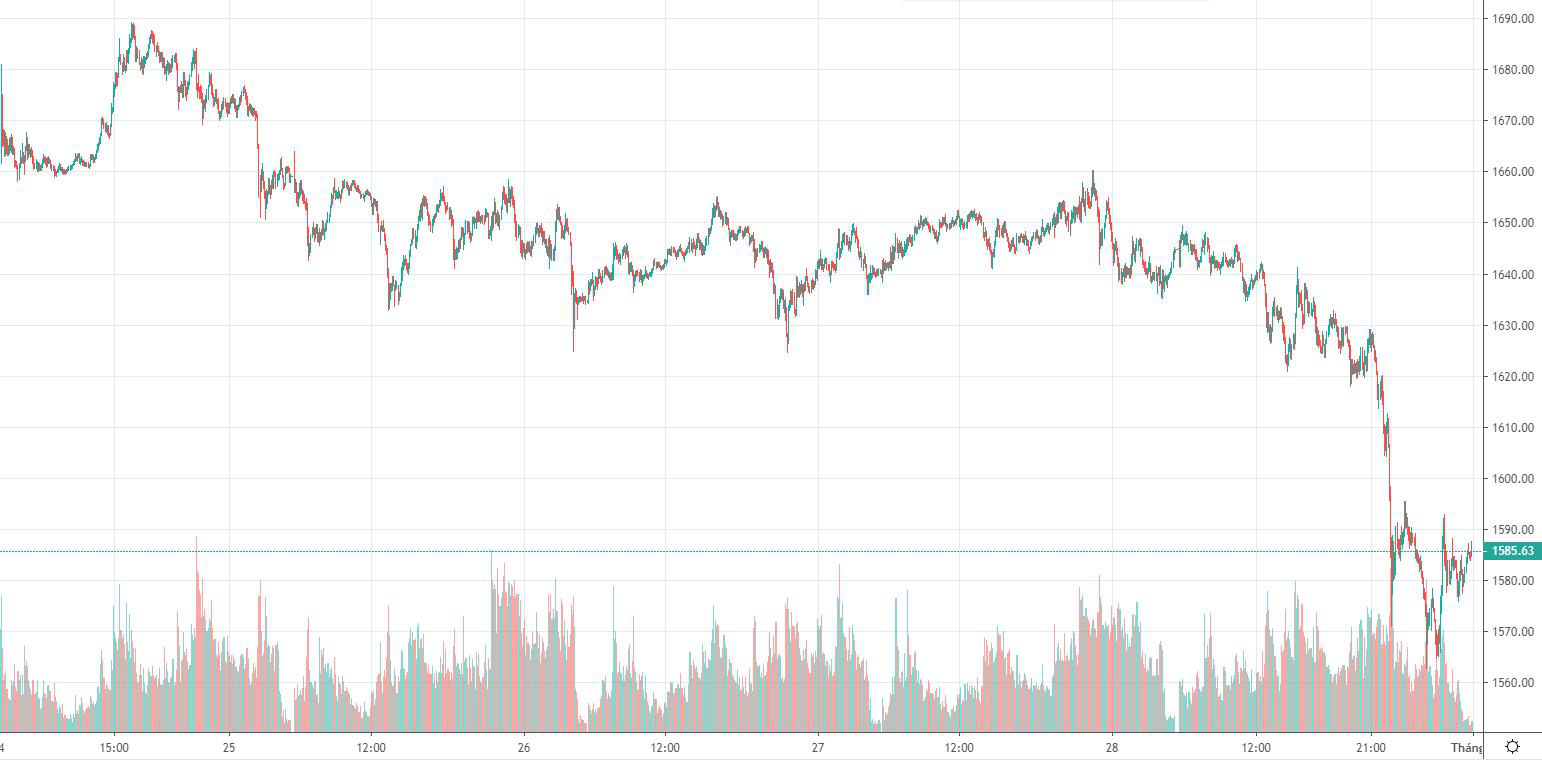 Tuy nhiên, sau khi tăng giá đến mức kỷ lục vào ngày 24/02, giá vàng liên tục giảm mạnh trong những ngày sau đó. Kết thúc phiên giao dịch cuối tuần, giá vàng chỉ còn 1.585 USD/ OZ so với mức đỉnh 1.688 USD/ OZ hồi đầu tuần.