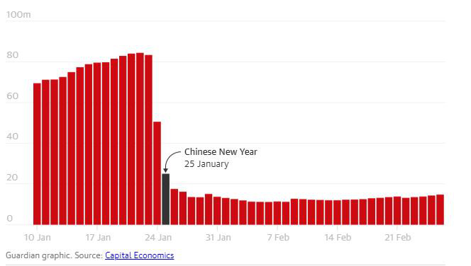 Số lượng chuyến du lịch ở Trung Quốc giảm mạnh kể từ sau Tết Nguyên Đán – thời điểm thông tin về dịch bệnh bắt đầu xuất hiện (Nguồn: Capital Economics, The Guardian)