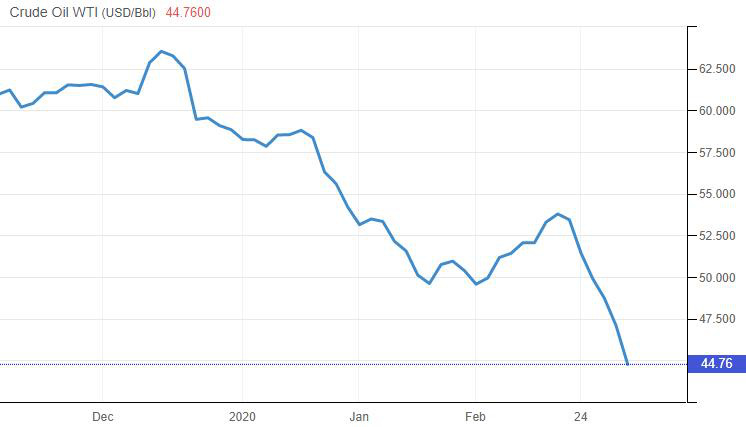 Cơ quan năng lượng quốc tế (IAEA) dự báo nhu cầu dầu mỏ toàn cầu có thể giảm tới 1 triệu thùng mỗi ngày do ảnh hưởng từ dịch bệnh. Điều này đã dẫn đến giá dầu thế giới đã giảm xuống dưới 50 USD một thùng lần đầu tiên sau trong hơn một năm qua.